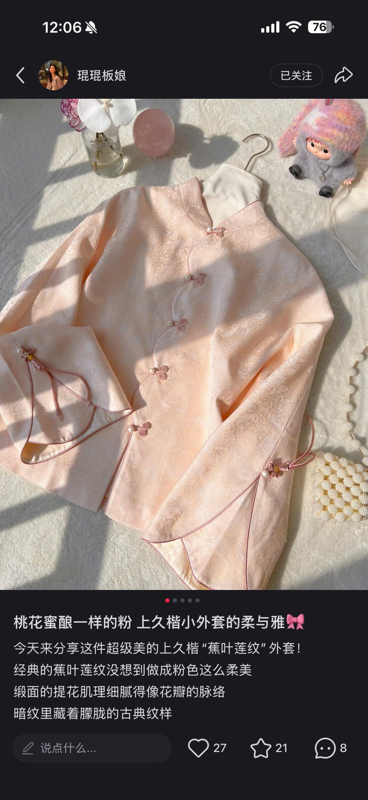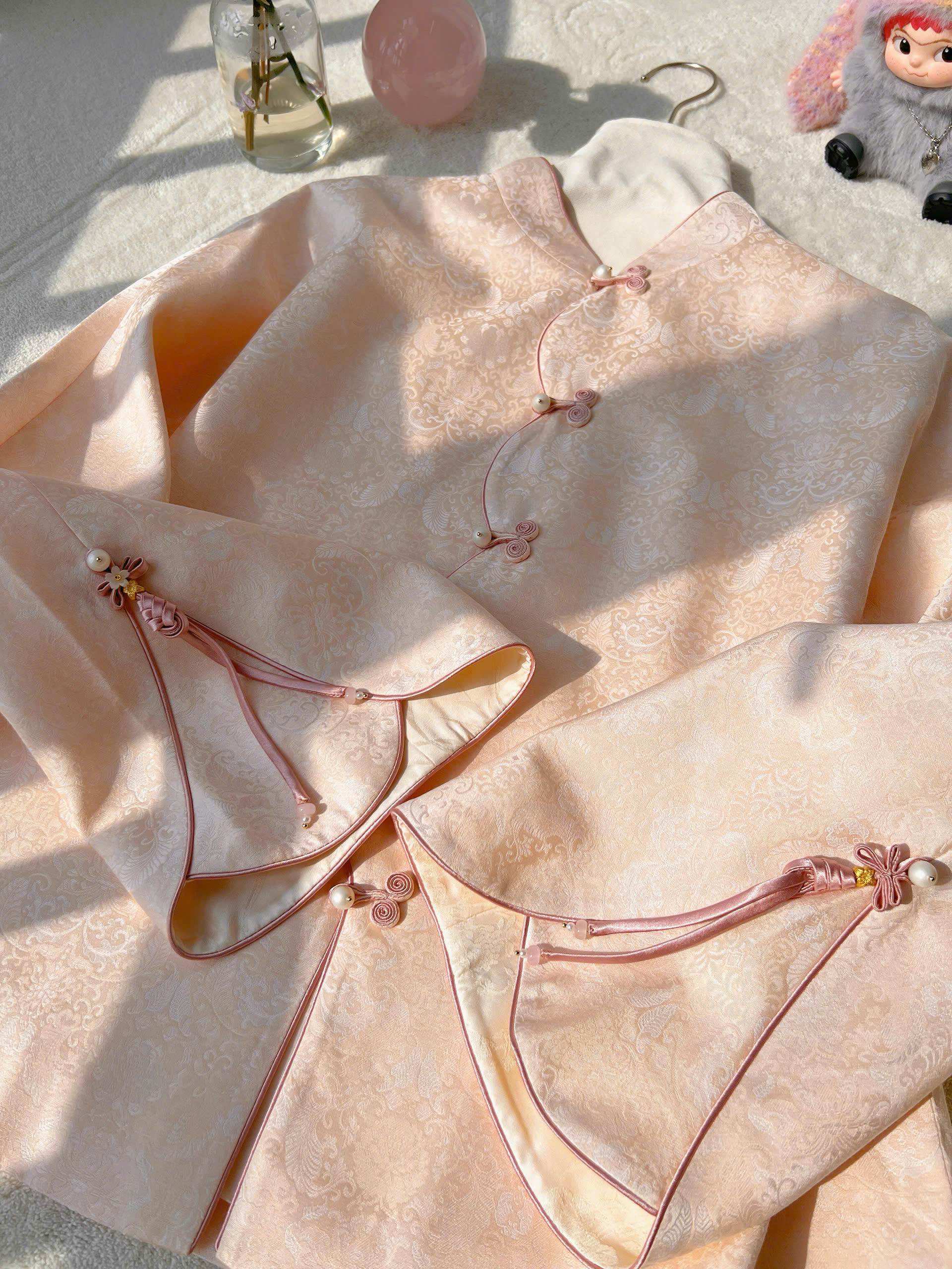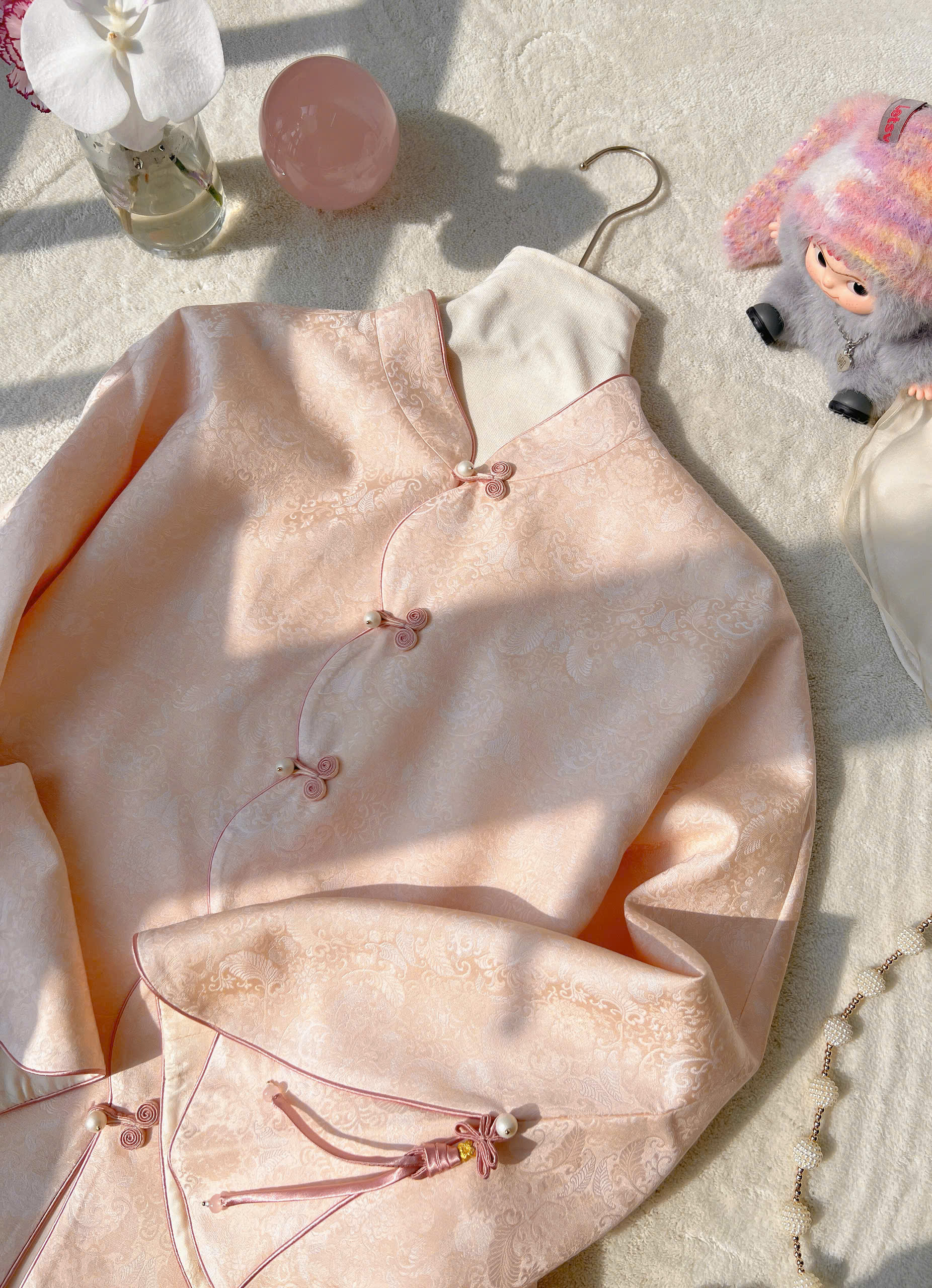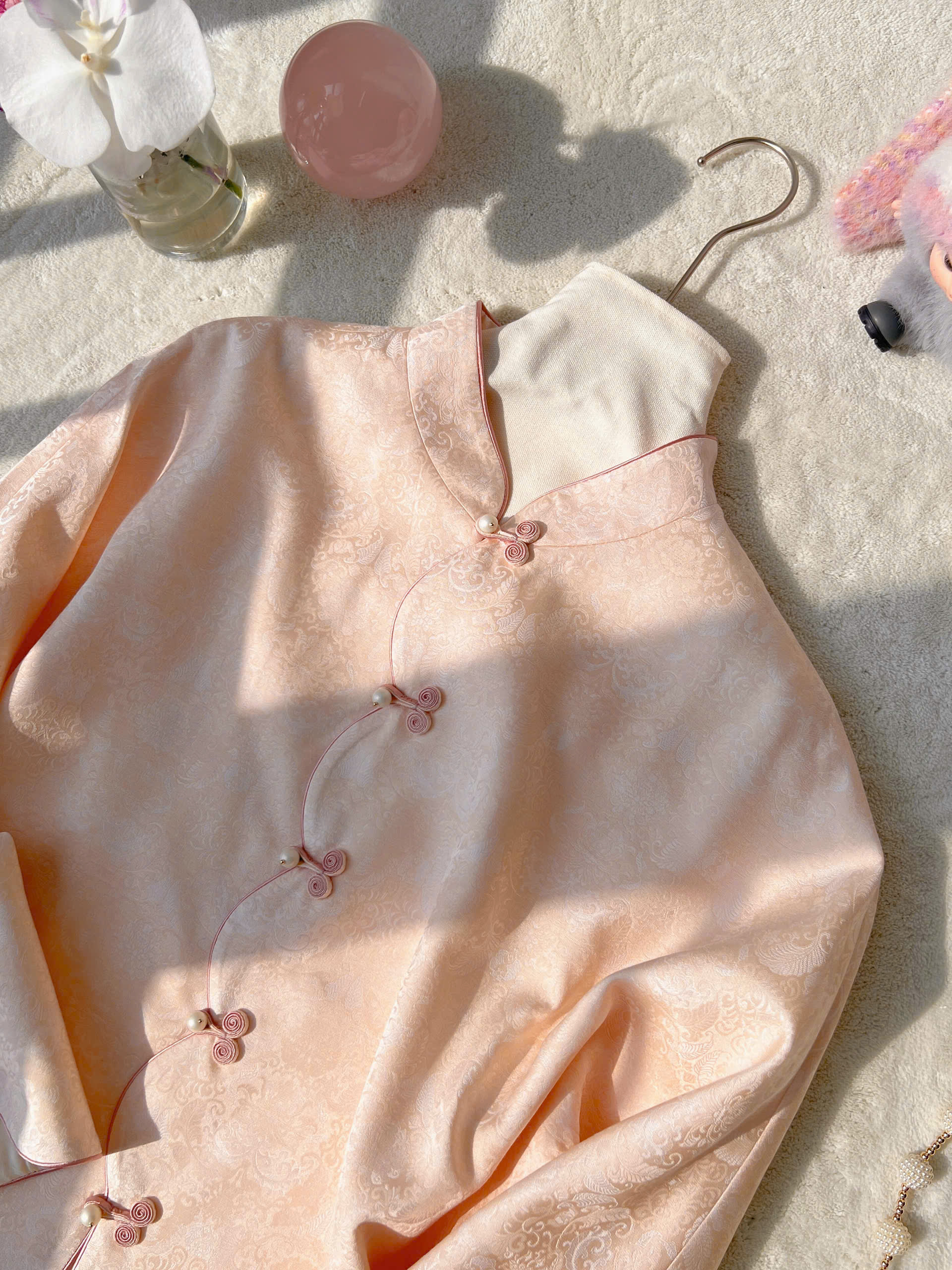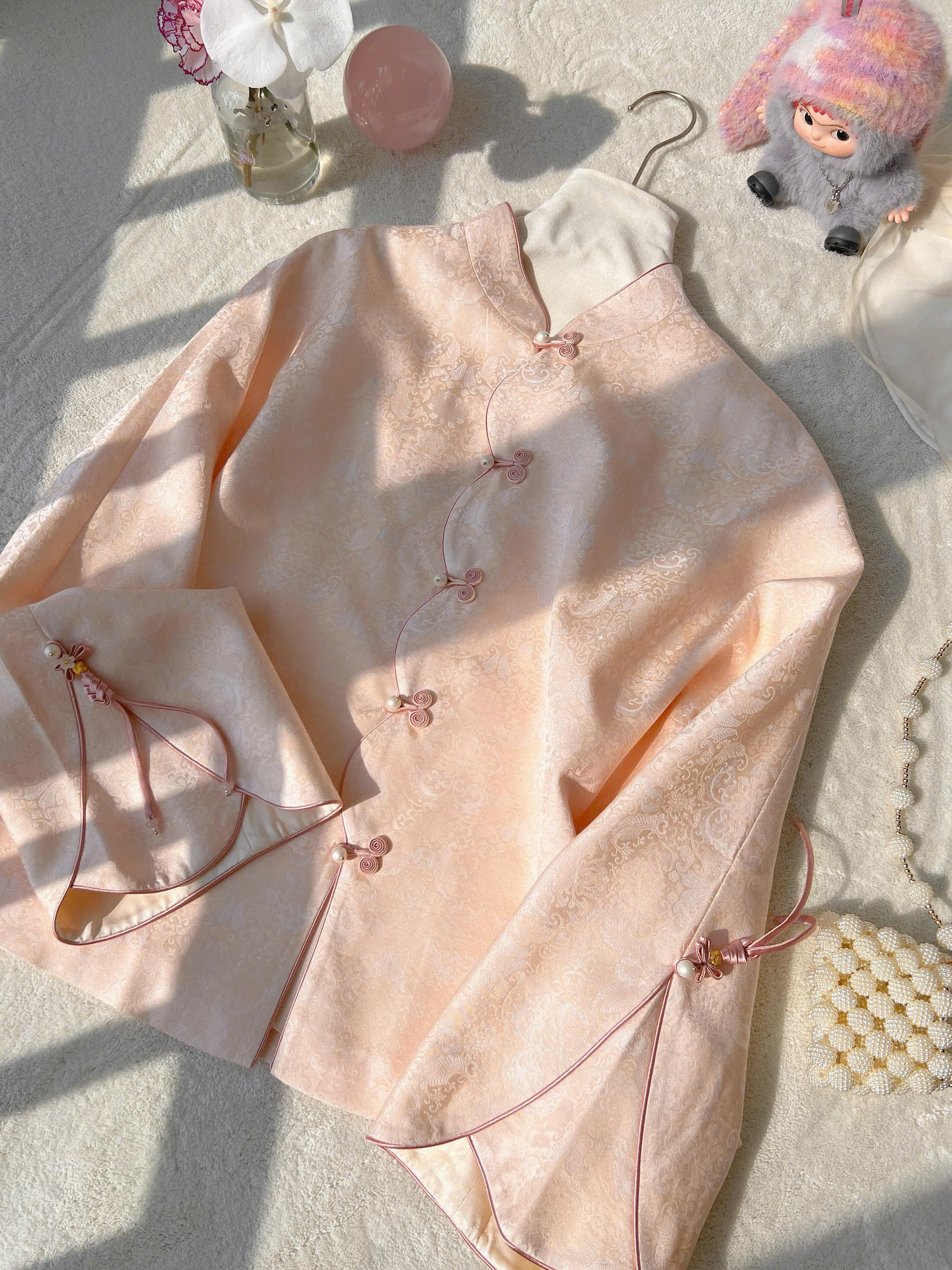 Thiết kế Vạt Chéo & Khuy Ngọc Trai: Điểm nhấn nằm ở hàng khuy tết thủ công (khuy tàu) phối cùng hạt ngọc trai lấp lánh, tạo nên vẻ đẹp cổ điển nhưng không kém phần thời thượng.