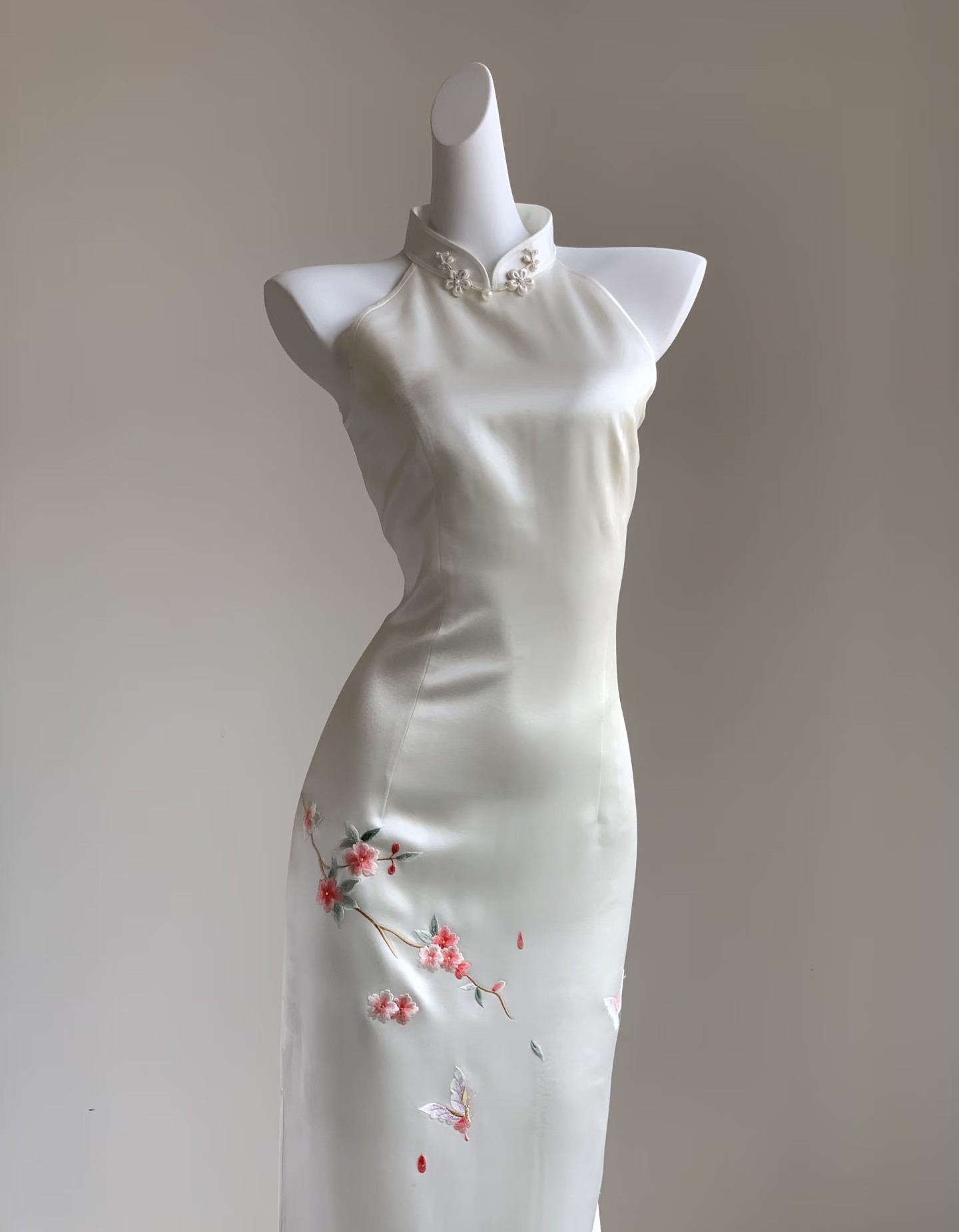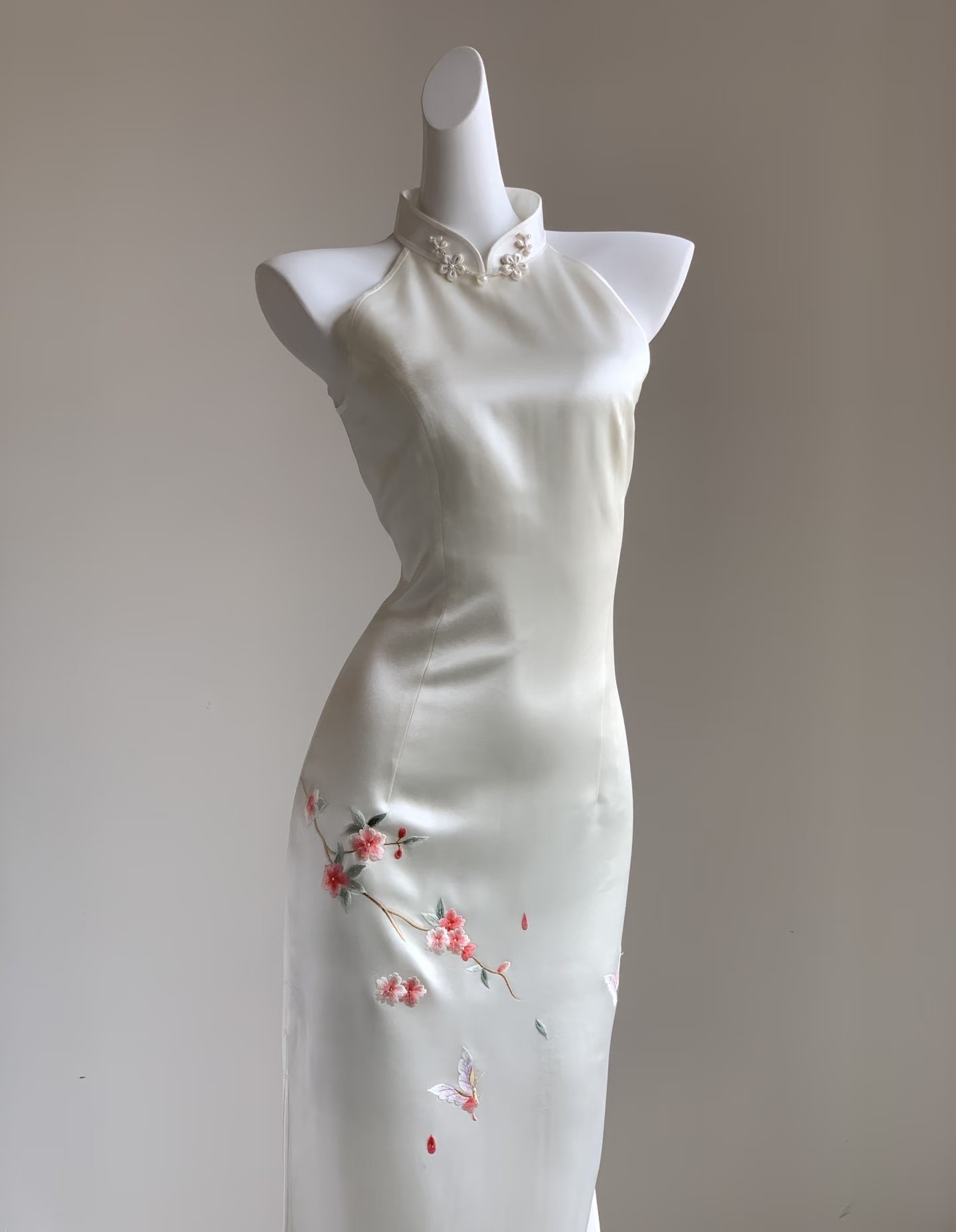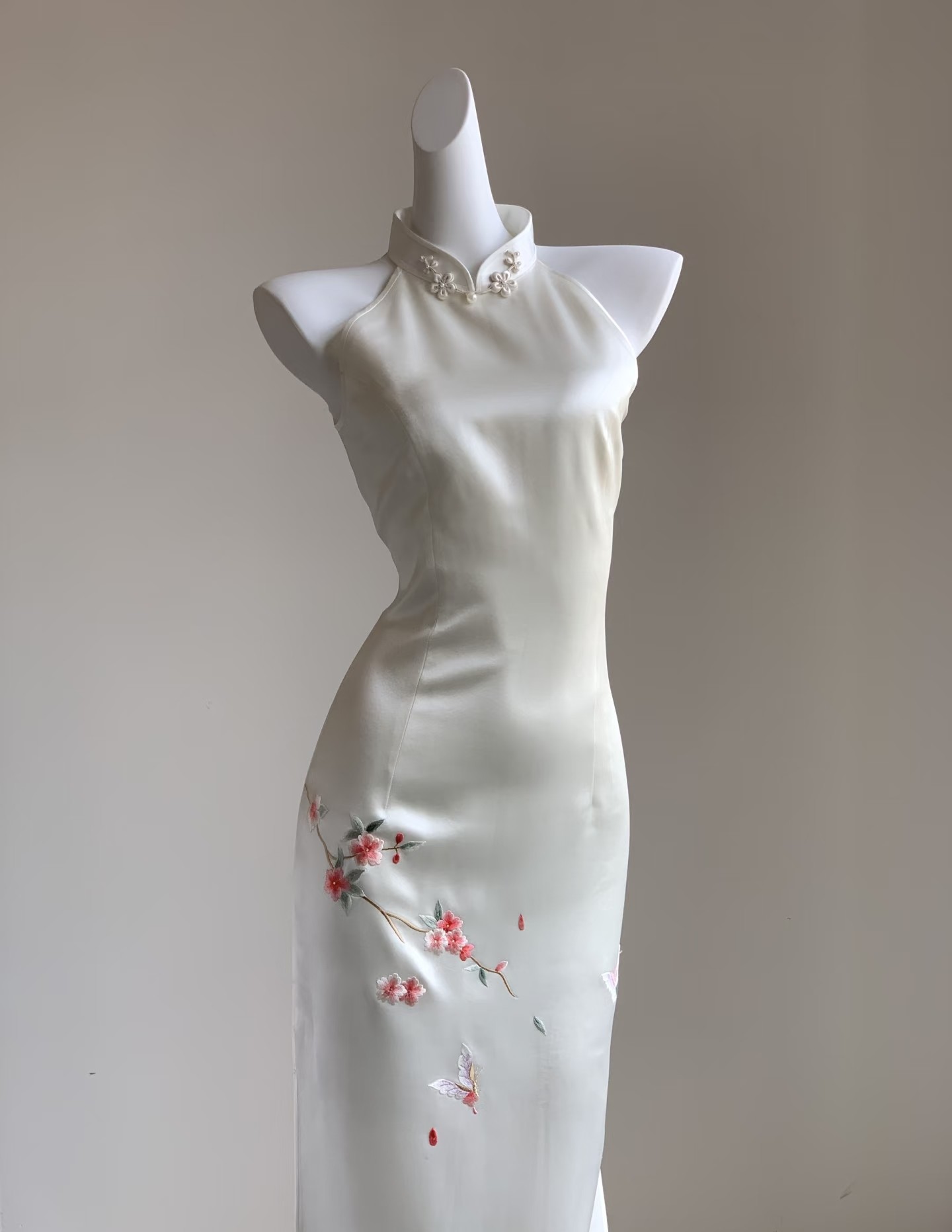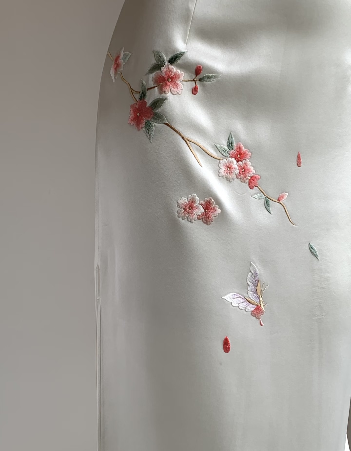 Váy Sườn Xám (旗袍) Cao Cấp Xing Store – Trắng Sứ Thượng Hạng, Họa Tiết Mẫu Đơn Thêu Tay Sắc Sảo